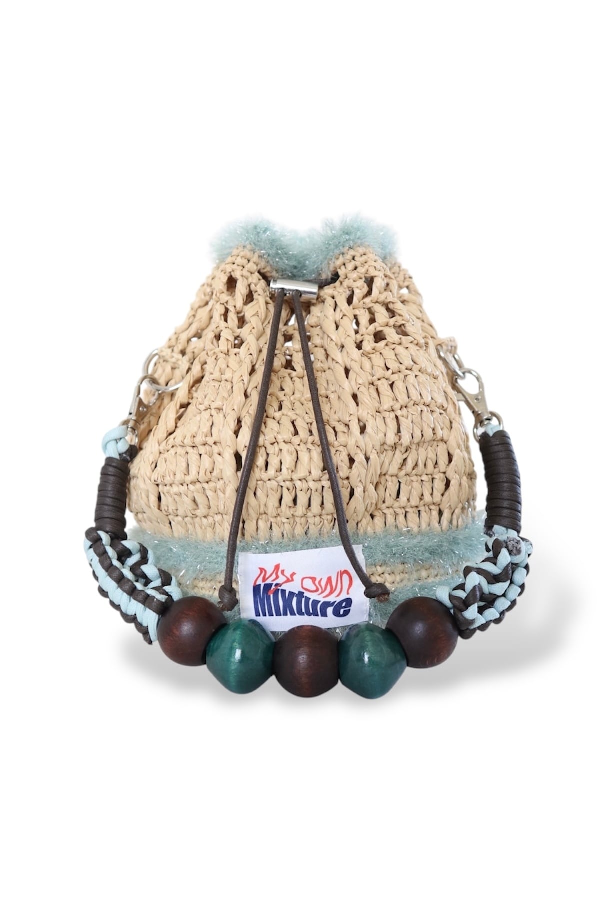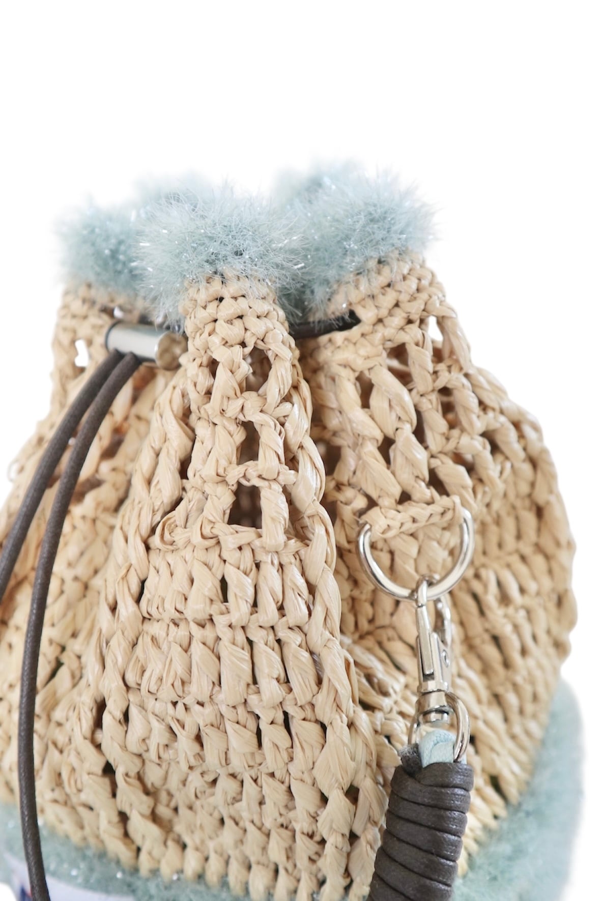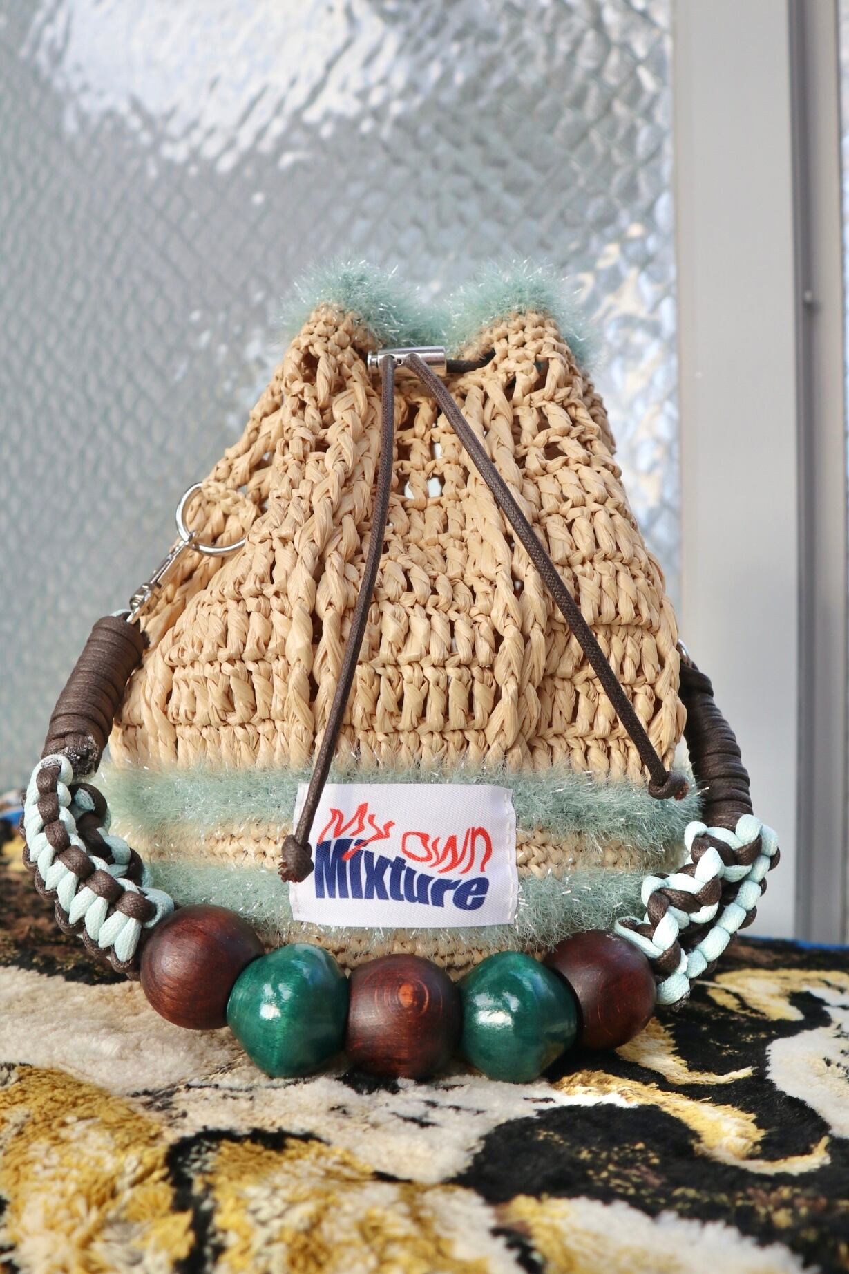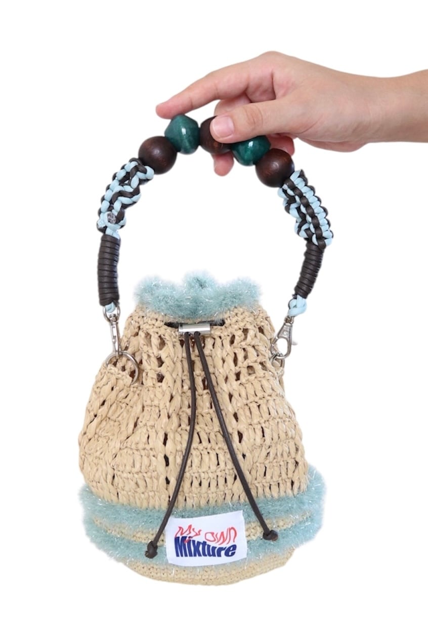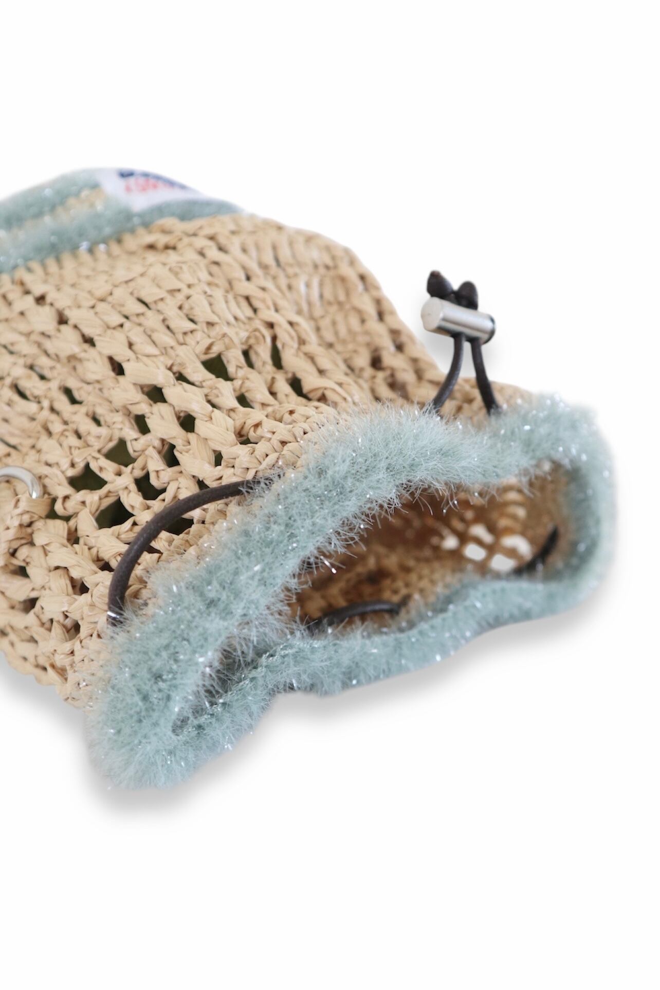 木材の再生繊維を使用した糸とキラキラの糸を差し色に掛け合わせた、涼しげな巾着バッグです。