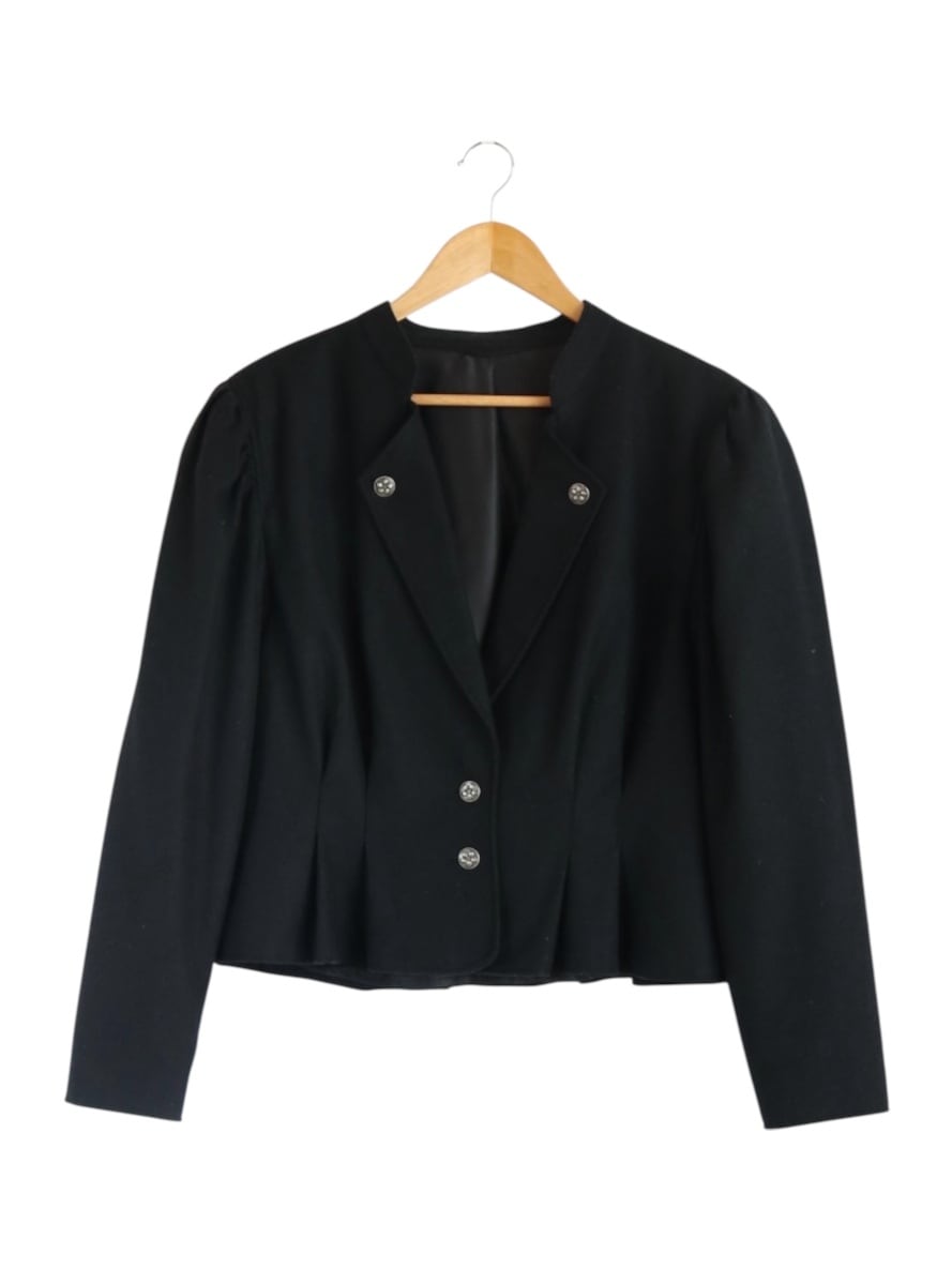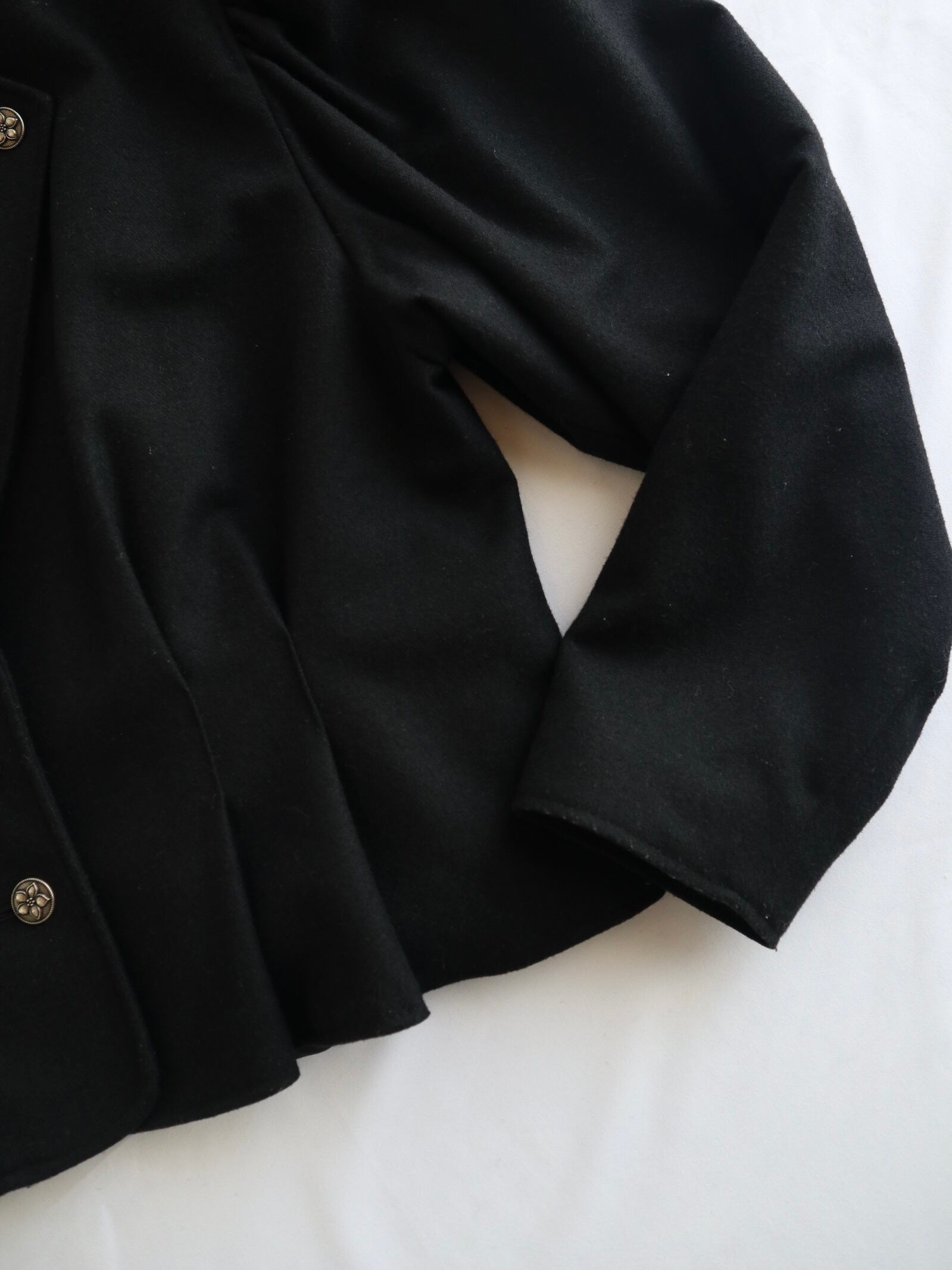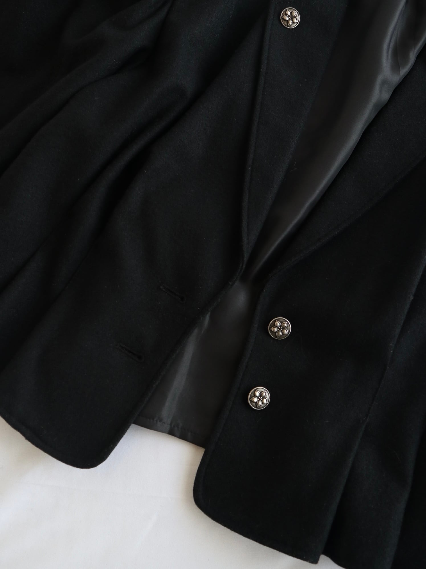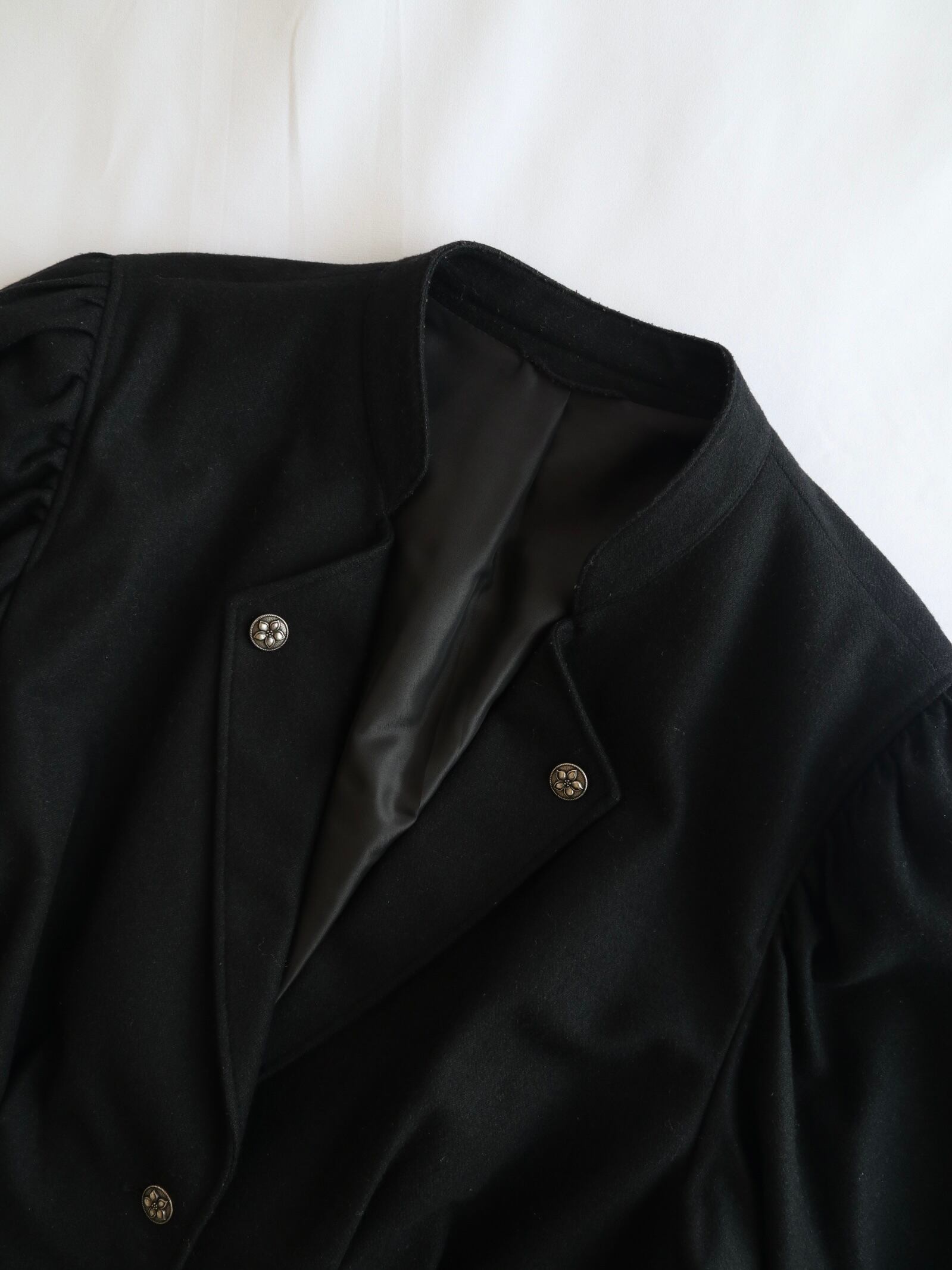 深みのある黒色、厚みのあるウール生地、装飾は花模様が施されたシルバーのボタン。