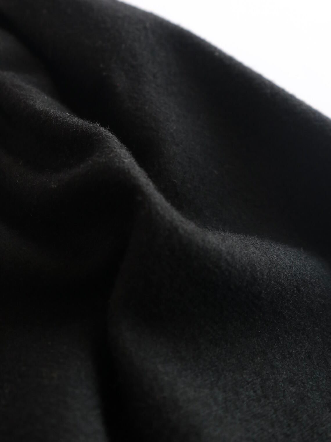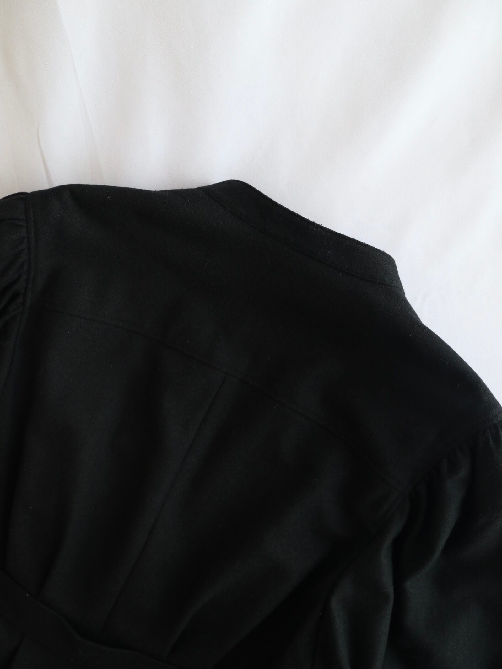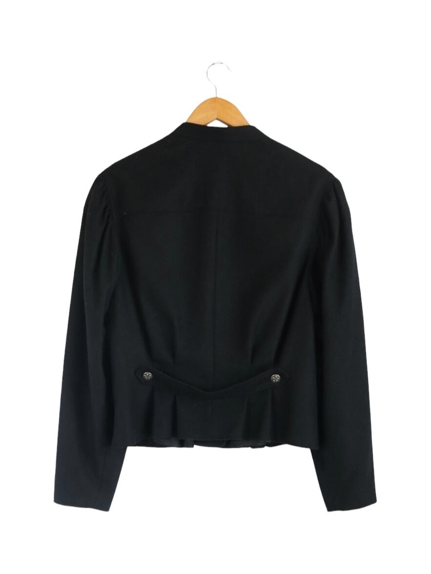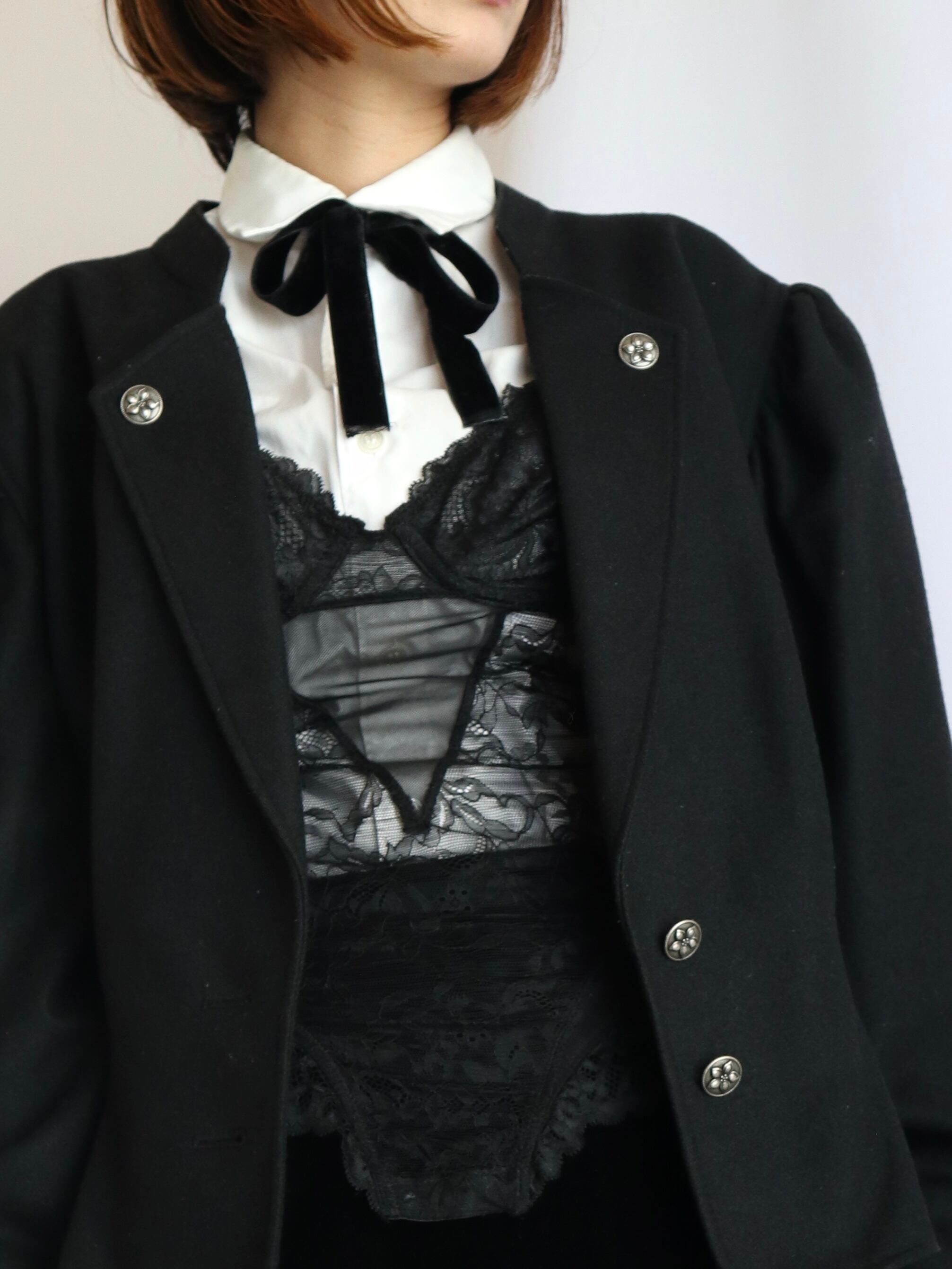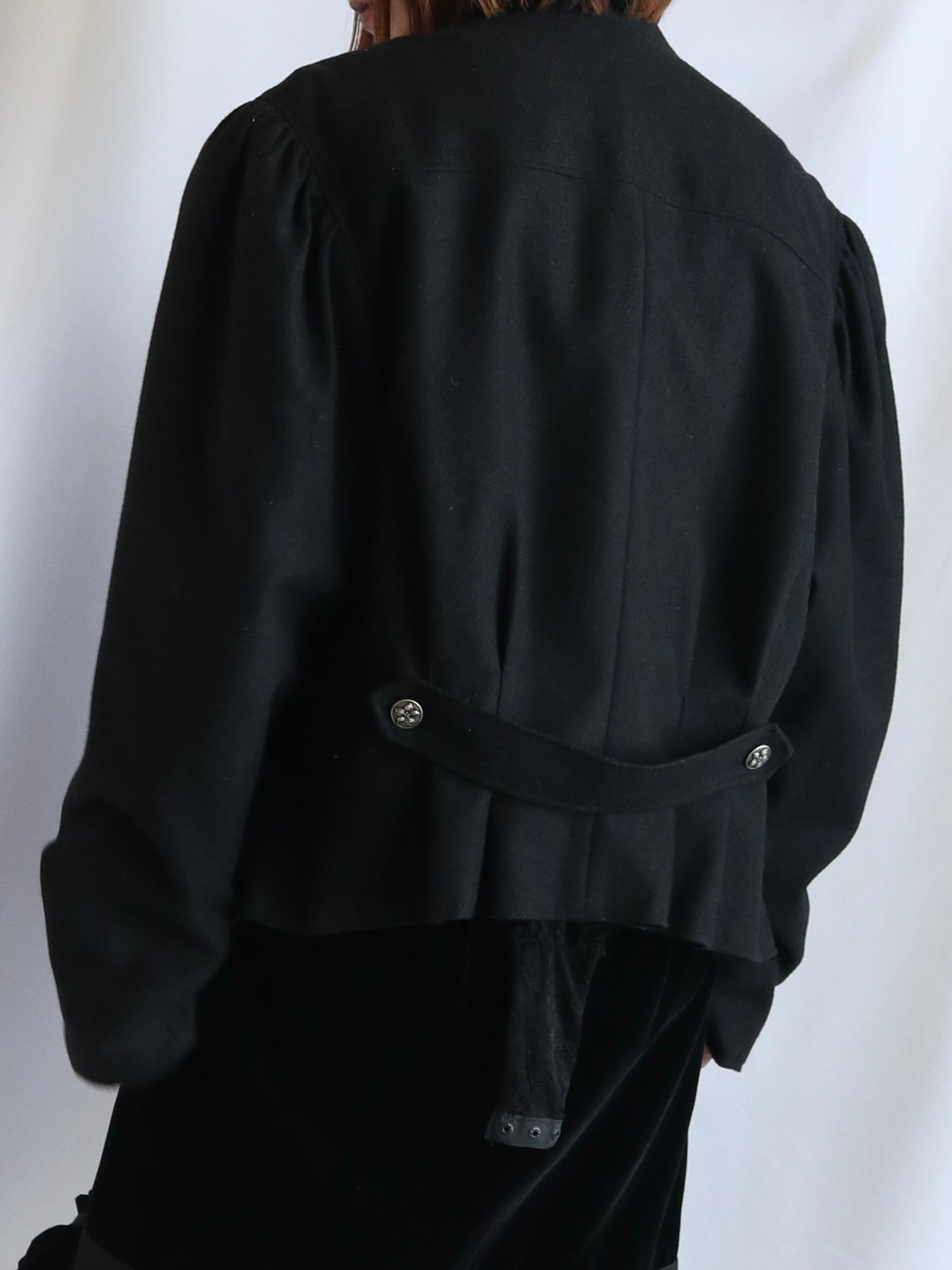 深みのある黒色、厚みのあるウール生地、装飾は花模様が施されたシルバーのボタン。