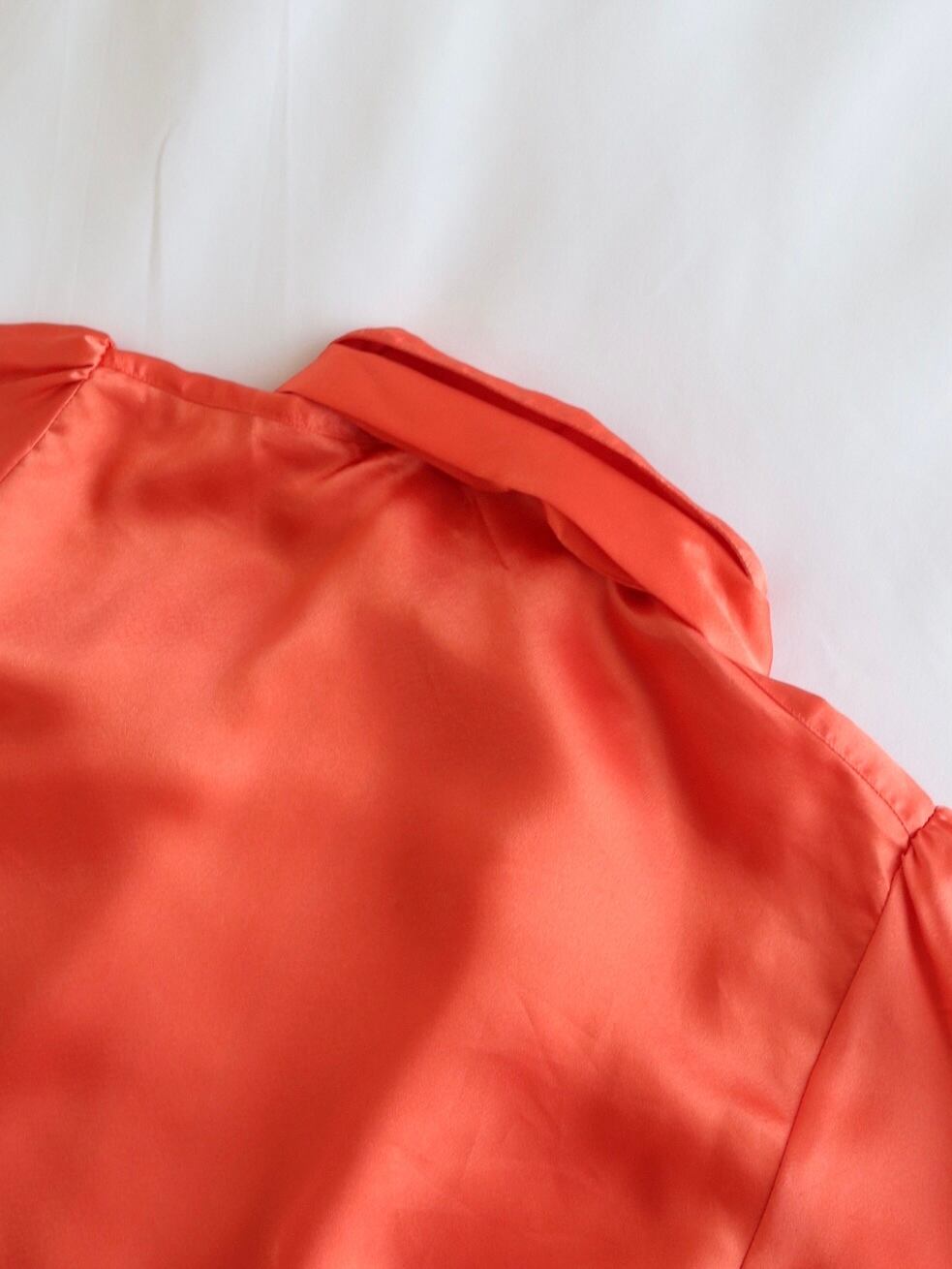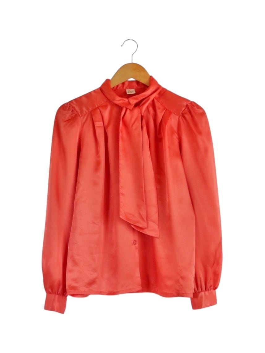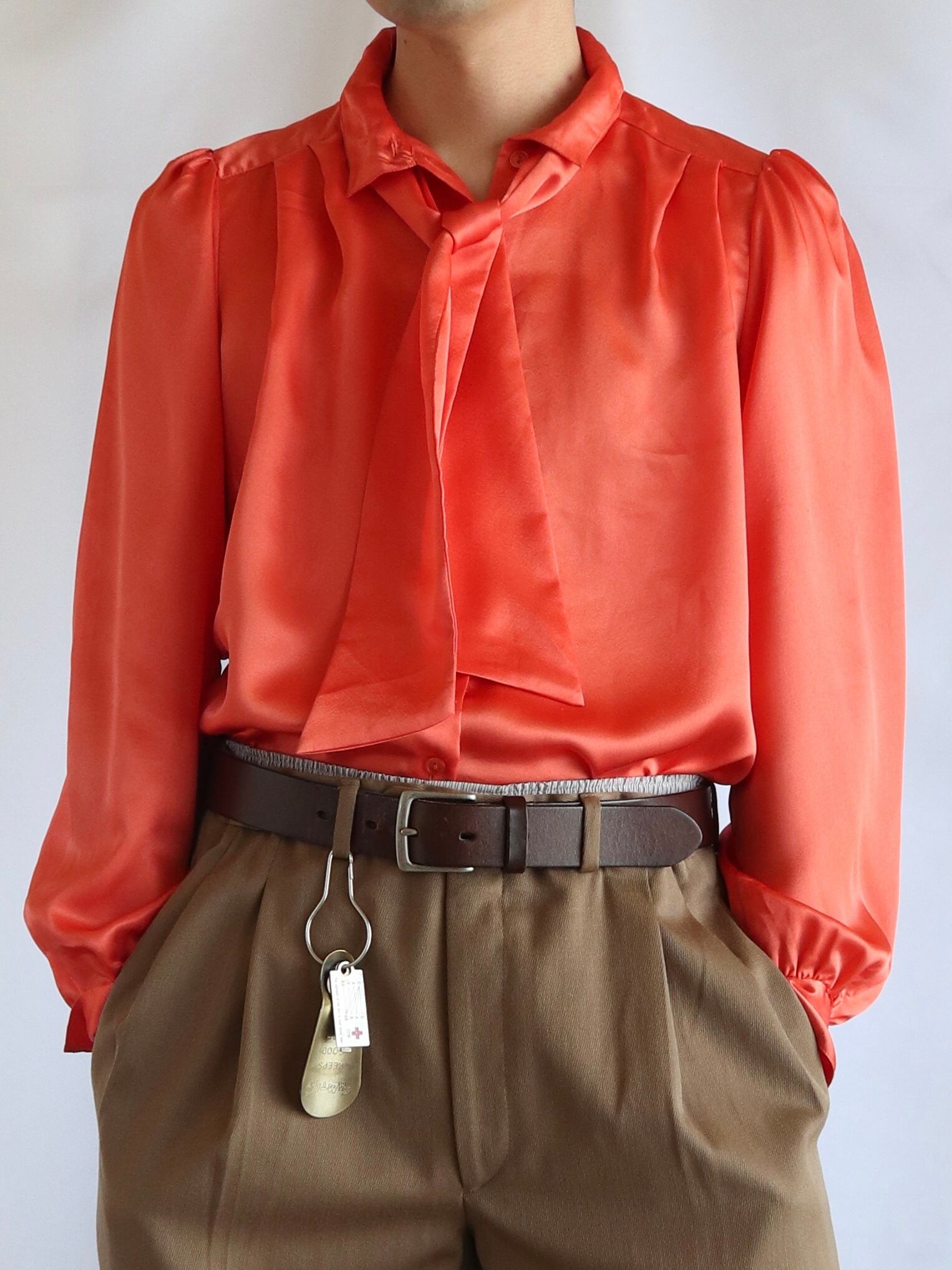 品のある光沢感のボウタイブラウス。