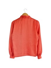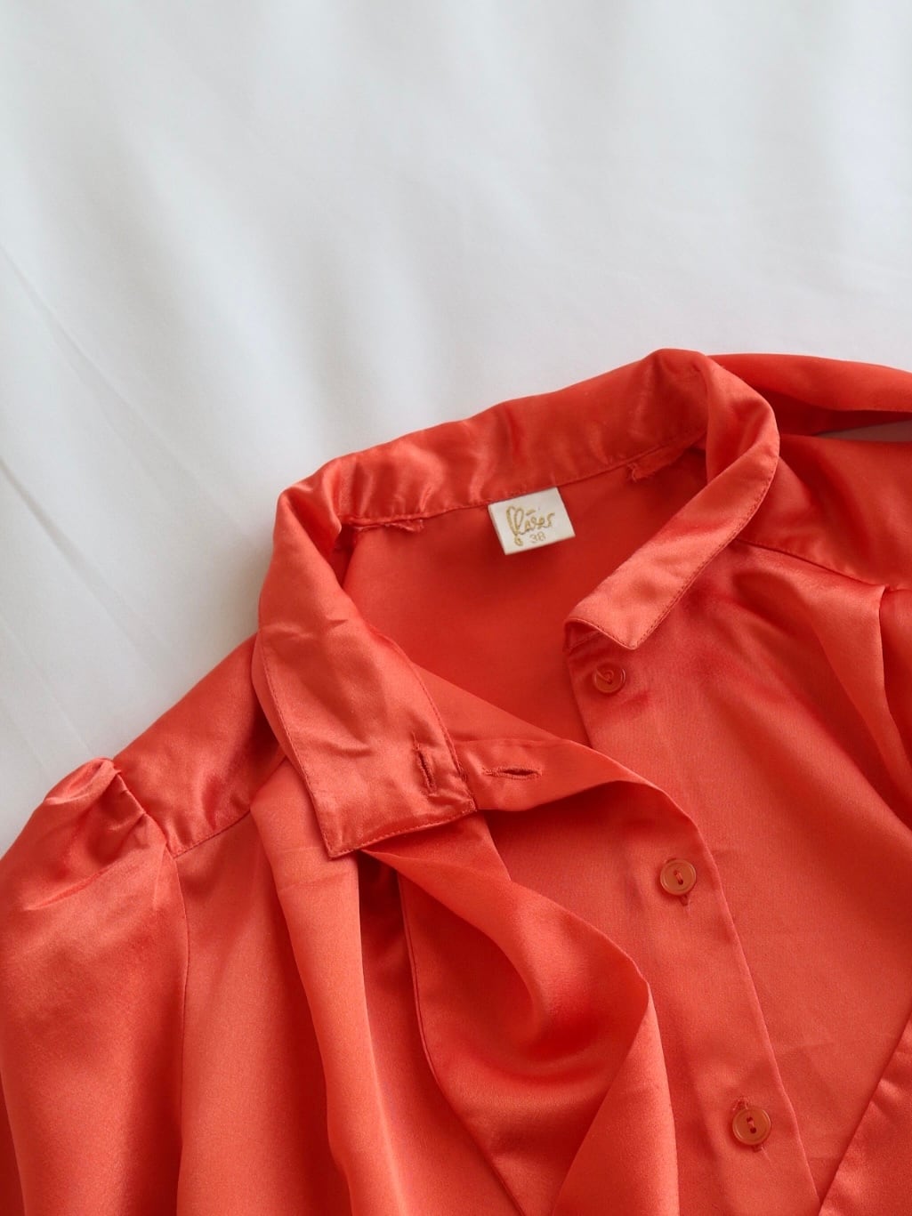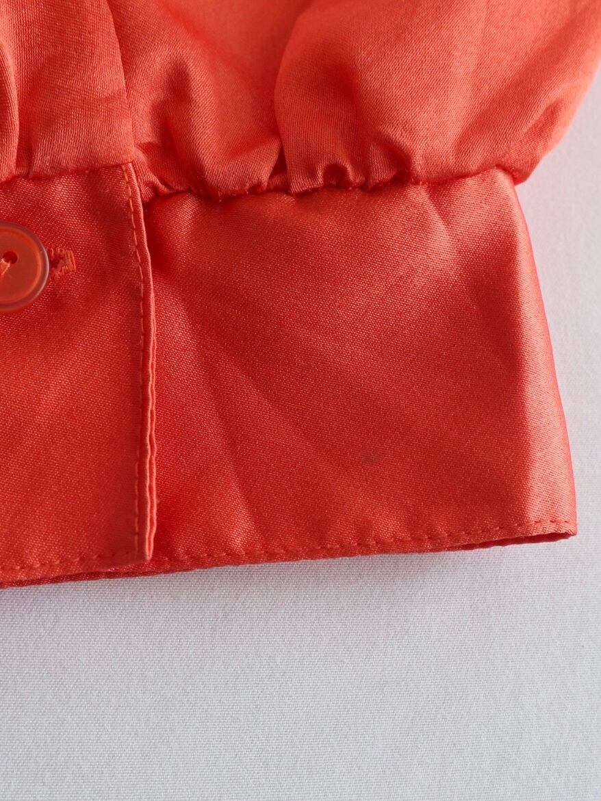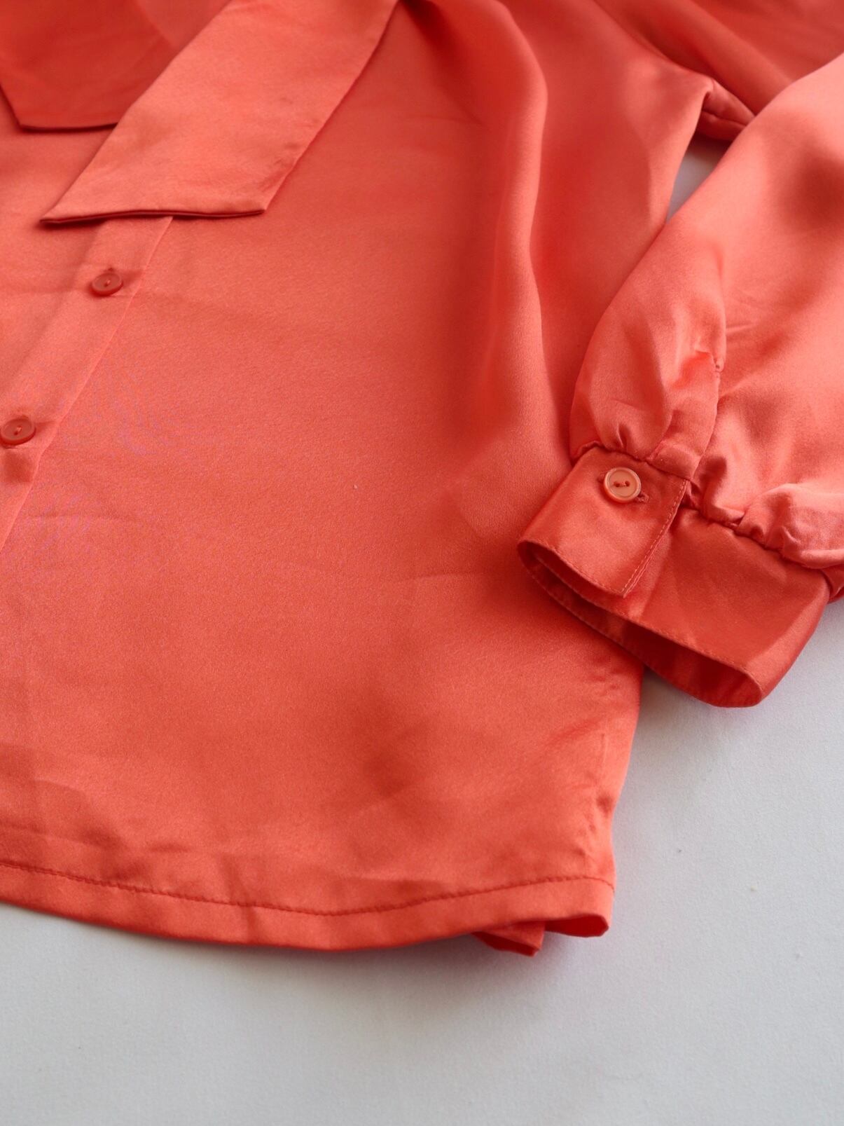 品のある光沢感のボウタイブラウス。