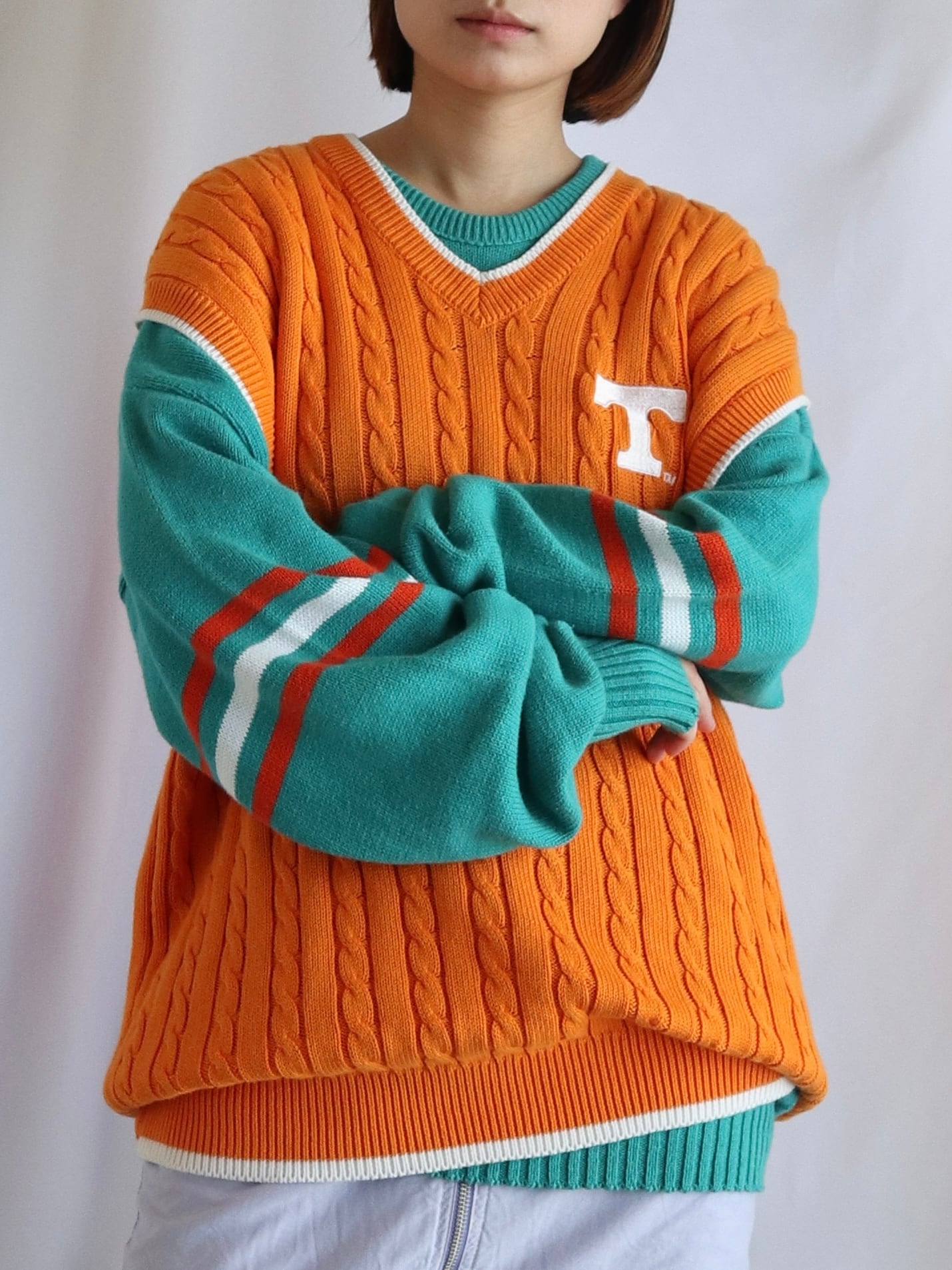 一枚でも決まりますが、袖のラインが強調されるベストのインナーとしてもおすすめです。