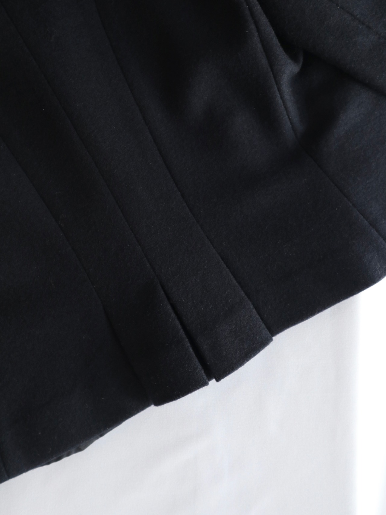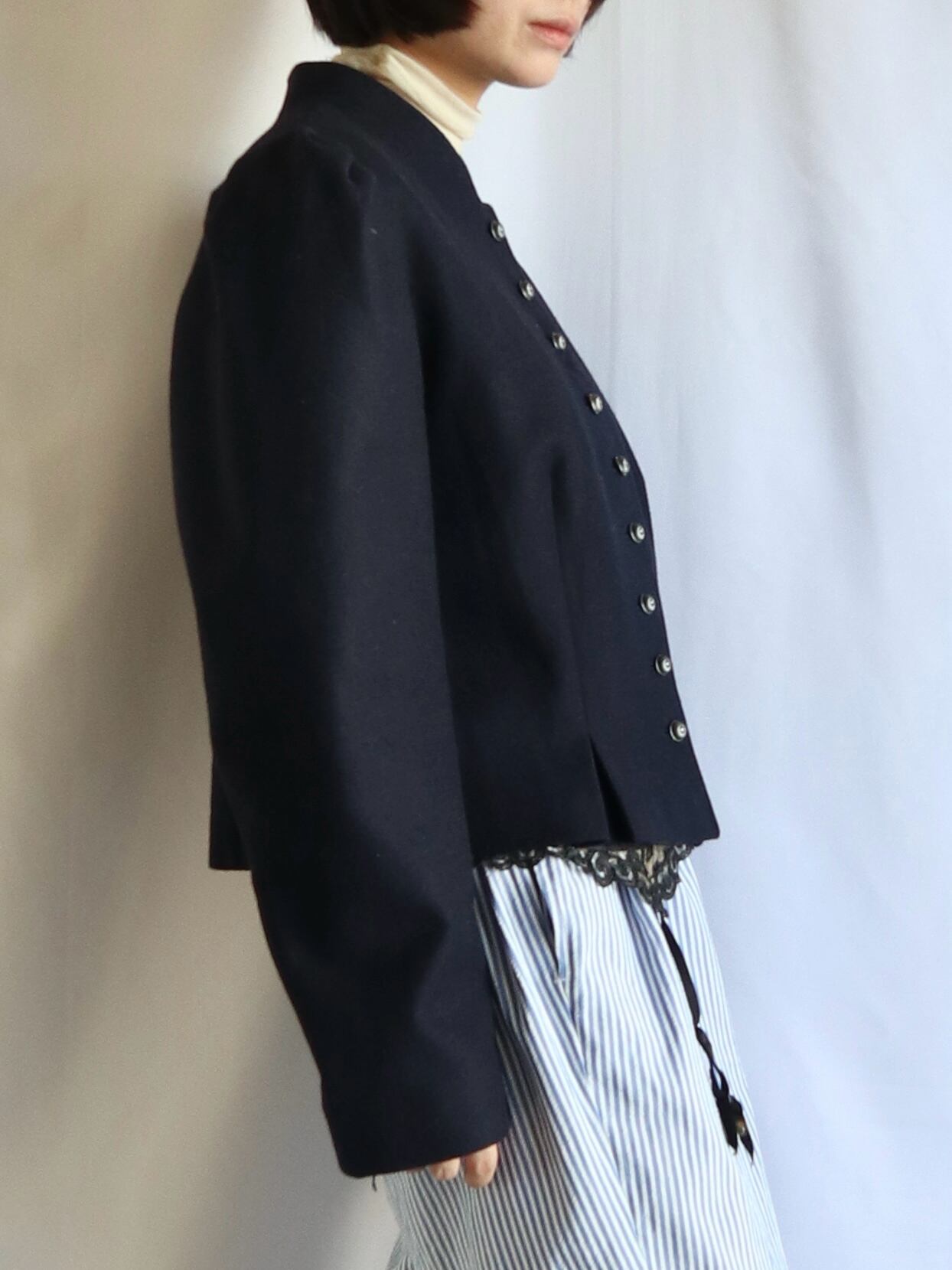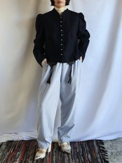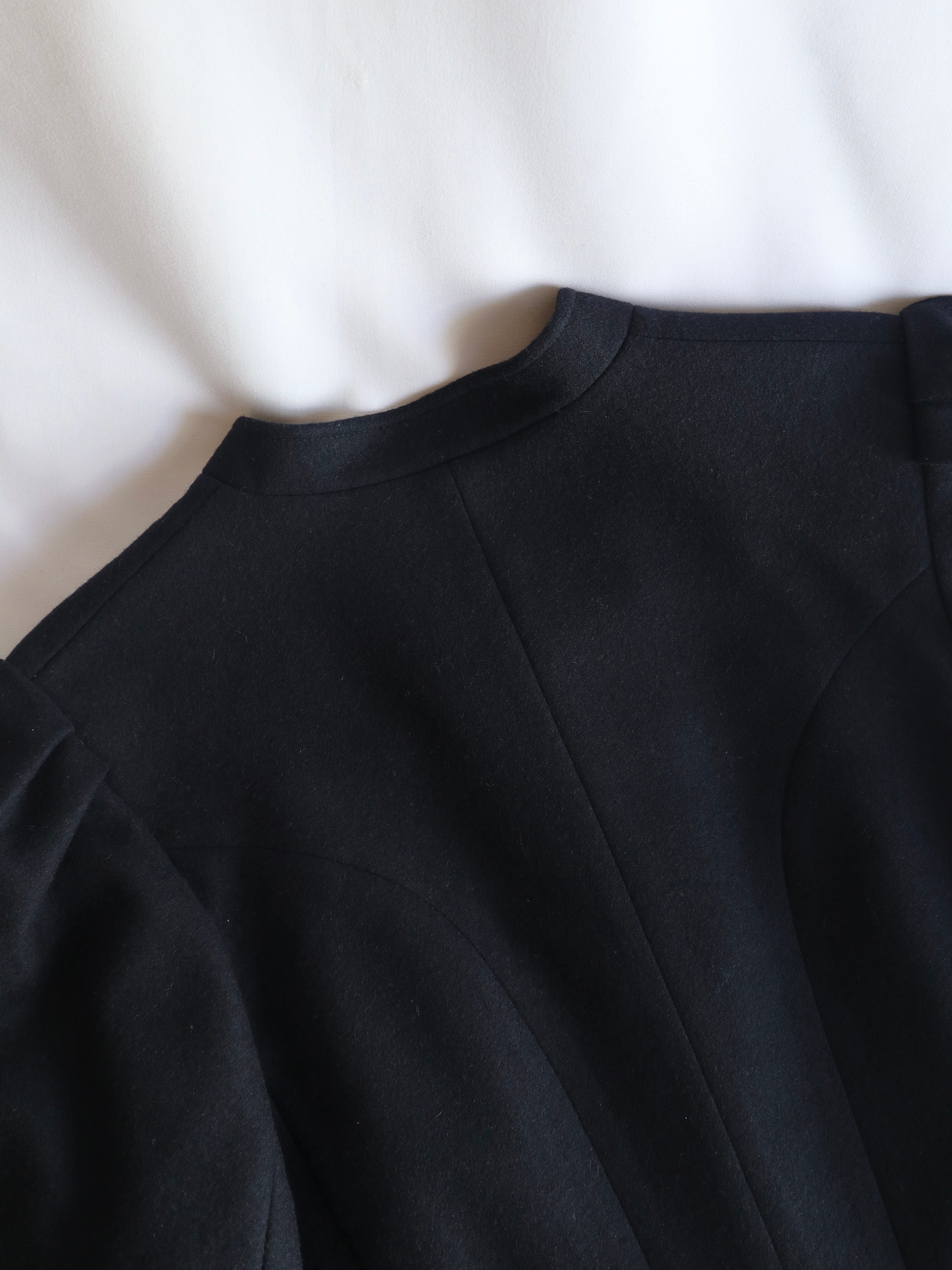 腰位置が高く見える短めの丈と、ボリュームのある肩のデザインはスタイルにメリハリが生まれます。