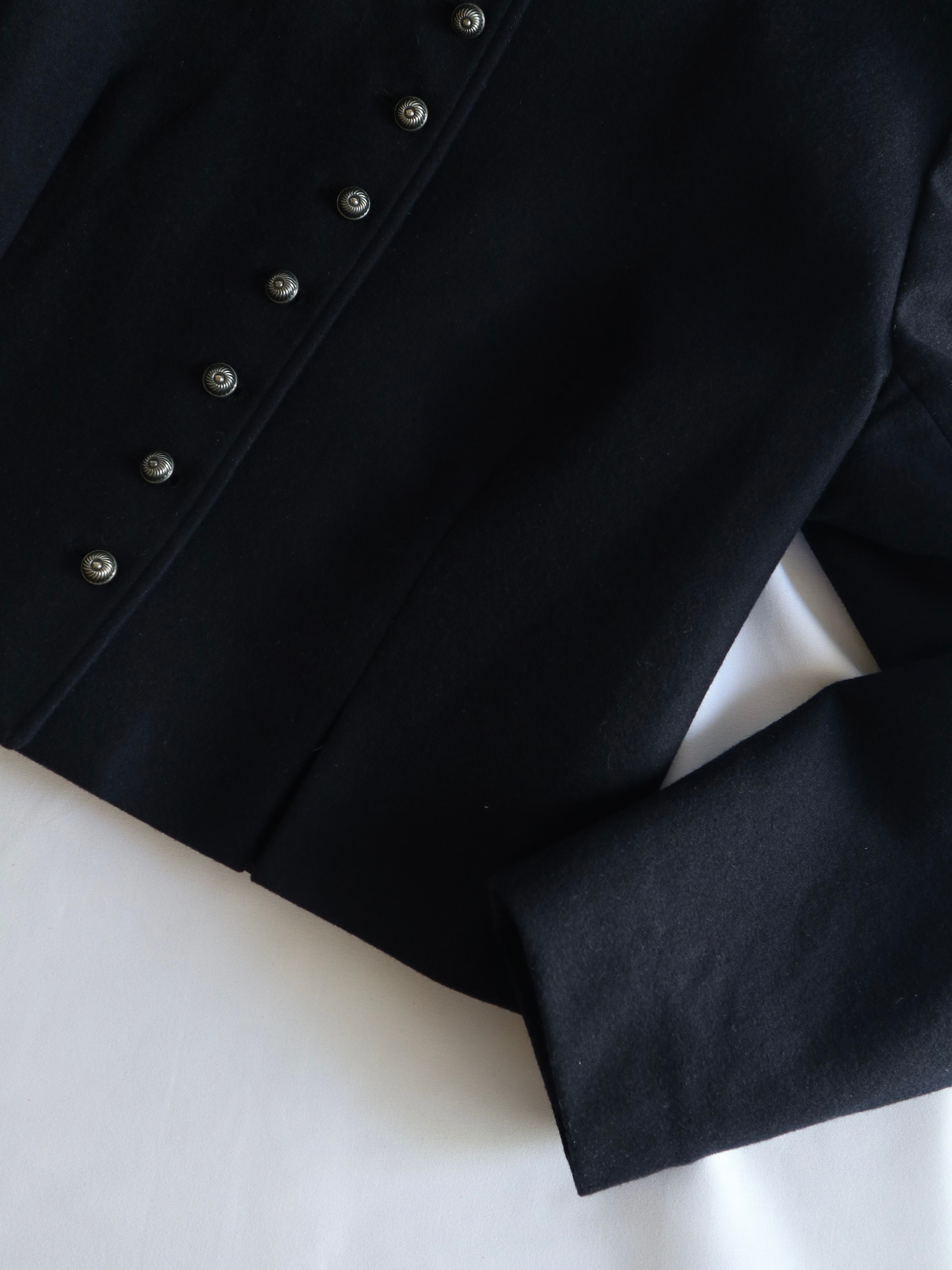コロンとした小さなボタンには花柄の装飾が施されており、シンプルに見えて細部まで抜かりないデザインが洗練された印象を受けます。